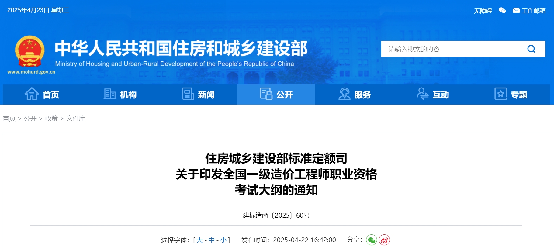根据住房城乡建设部、交通运输部、水利部、人力资源社会保障部联合印发的《造价工程师职业资格制度规定》和《造价工程师职业资格考试实施办法》(建人〔2018〕67号),我们会同有关部门组织编制了《全国一级造价工程师职业资格考试大纲》,经人力资源社会保障部审定,现予印发,自2025年5月1日起施行。考试大纲可从住房城乡建设部网站“政策发布”栏目下载。