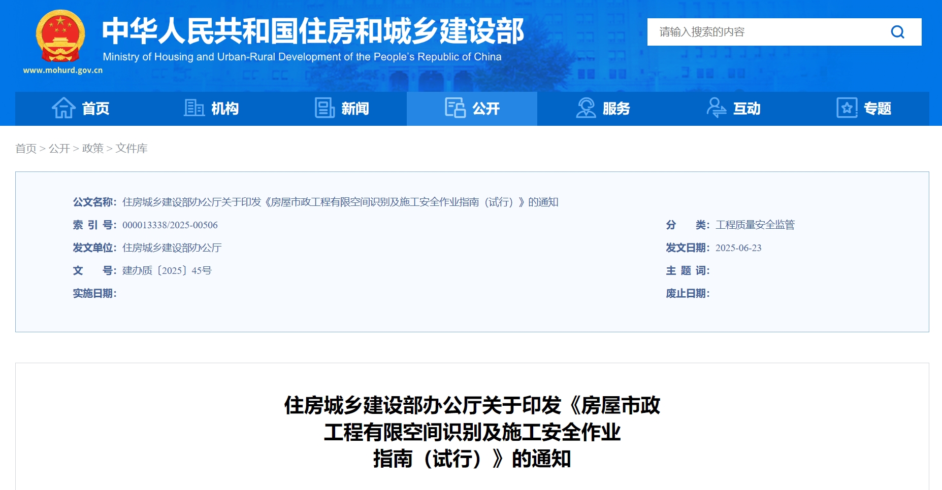 为进一步做好房屋市政工程安全生产管理工作,提高有限空间作业风险识别、安全管控和应急处置能力,住房城乡建设部制定了《房屋市政工程有限空间识别及施工安全作业指南(试行)》。现印发给你们,请遵照执行。